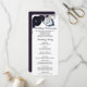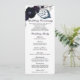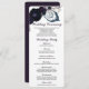 Elegant wedding ceremony program card illustrated with hand drawn flowers in deep shades of purple and navy blue. Light blue and green feathers, leaves and twigs in watercolor hand painted style. Modern script typography. Ideal for fall or winter season wedding. Main colors are purple, dark purple, blue, black and dark blue. Sophisticated handwritten font style, with classic chic typography. Trendy wedding stationery set. Some elements by CreateTheCut.com.