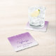 These chic 21st birthday party paper coasters feature a sparkly purple faux glitter drip border and purple ombre background. Personalize them with the guest of honor's name in purple handwriting script, with her birthday and date below in sans serif font.