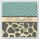 A chic quatrefoil pattern on a turquoise backdrop along with a gold ribbon for personalization and below that is a stylish giraffe print for animal exotic vibes.