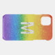 Carry your cell phone and protect it in style with this custom glitter and glam phone case. The chic rainbow striped design includes shades of red, orange, yellow, green, blue and purple faux glitter with a monogram initial in white and name in modern black script for you to personalize. Show your pride!