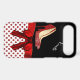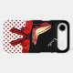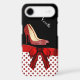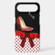 Chic iPhone 6 case done in black, on the top and a white with red glitter looking polka dot print, on the bottom. Graphics of a red satin ribbon and bow decorates the middle and a pair of red glitter looking stiletto heels are on the top half. Personalize the white text for yourself or as a great gift idea.