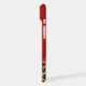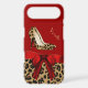 Fashionable Samsung Galaxy S7 case done in red, on the top and a spotted brown and black jaguar print, on the bottom. Graphics of a red satin ribbon and bow decorates the middle and a pair of jaguar print stiletto heels are on the top half. Personalize the tan text for yourself or as a purrfect gift idea.