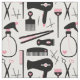 Hair stylist fabric in a chic retro design with hair salon tools in black, pink, and white with cute little hearts.