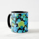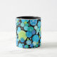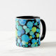 A chic Ringer Mug with a quirky Blue Moons pattern in Aqua, Turquoise, Emerald Green, Neon Green and Dazzling Blue on a black background. Part of the Posh & Painterly 'Blue Moons' collection.
