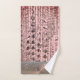 On this stylish towel set are sparkly stringed rose blush pink beads on a pink backdrop with a pink glittery banner for extra glam. Girly elegant vibes. Can be personalized on the pink glittery banner