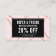 A fun and eye-catching design of falling faux rose gold bobby pins create an intriguing background on this stylish referral card for hairstylists, hair salons, beauty consultants and more. Update the promotion for your own unique offering. This design is part of a collection of coordinating marketing materials to help brand your beauty business. Find business cards, appointment cards, gift certificates, rack cards and more on the matching collection page.