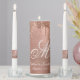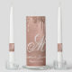 This chic personalized monogram wedding unity candle set for newlyweds features an elegant white monogram initial in script calligraphy with your names and wedding date below on a faux rose gold brushed metallic background with sparkly dripping glitter. Designed by Susan Coffey.