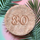 This chic, girly design features a pattern of sparkly rose gold leopard spots on a blush pink background, with "80" in large rose gold balloon numbers. Ideal for a trendy 80th birthday party.