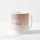 This elegant modern mug features a background image of rose gold ombre faux glitter. Personalize it with your monogram initial in white serif font, your name in charcoal gray calligraphy script, and your service or profession below in gray sans serif font.
