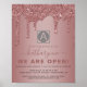 Chic Rose Gold Sparkle Glitter Drips Business Opening Sign Poster with our trendy faux glitter drips in blush pink/rose gold and your name, business name, or logo. Perfect for advertising your opening, reopening, or just for showing off your luxury esthetic. You're dripping in luxury, so your gear should be, too! Please contact us at cedarandstring@gmail.com if you need assistance with the design or matching products.