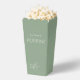 Delight wedding guests with a surprise midnight snack. This lovely wedding favor popcorn box features couple monogram and text in ivory against a chic sage green background.