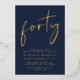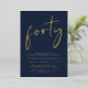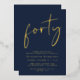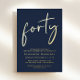Elevate your 40th birthday party with this chic dark blue invitation featuring "forty" showcased in a stylish script, your name in elegant serif typography and the party details in simple, modern lettering, all rendered in your choice of genuine gold, silver foil or rose gold foil.
