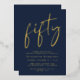 Chic dark blue 50th birthday party invitation featuring "fifty" showcased in a stylish script, your name in elegant serif typography and the party details in simple, modern lettering, all rendered in your choice of genuine gold, silver foil or rose gold foil.