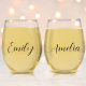 Chic set of stemless wine glass favors for your bridesmaids and bachelorette party and bridal shower guests with their names monogrammed in a thin elegant calligraphy script.