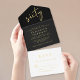 Elegant black 60th birthday party all in one invitation featuring "sixty" in a chic script, your name and "RSVP" in classic serif typography and the party details in simple lettering, all rendered in your choice of genuine gold, silver or rose gold foil. A white tear-away RSVP postcard provides a convenient envelope-free response option for your guests.