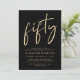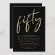 Chic black invitation for your 50th birthday party featuring "fifty" in a stylish gold script, your name in elegant gold serif typography, and the party details in simple, modern gold lettering.