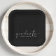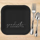 Elegant black graduation party paper plates featuring "graduate" in a chic modern white script and the grad's name and class year in simple white typography.