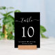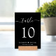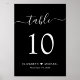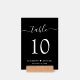 Chic black wedding reception 5X7 table numbers with giclee photo cards and wood holders. These signs feature "table" in a stylish white calligraphy script with swashes, the table number in elegant white serif typography, your first names joined together by a heart and your reception date. Create each table number sign and add to your shopping cart one at a time, then check out once all numbers are in your cart. After the wedding, order new giclee photo prints of your wedding day, honeymoon or other photos to replace the table number prints.