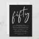 Chic black invitation for your 50th birthday party featuring "fifty" in a stylish white script, your name in elegant white serif typography, and the party details in simple, modern white lettering.