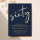 Elegant blue 60th birthday party invitation featuring "sixty" in a large chic script, your name in elegant serif typography, and the party details in simple lettering, all rendered in your choice of genuine gold, silver or rose gold foil.