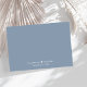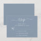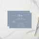 Chic dusty blue wedding RSVP card featuring "rsvp" in a stylish white script with swashes, simple and elegant white typography and your names joined together by a heart on the back.