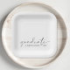 Chic graduation party paper plates featuring "graduate" in a modern script and the grad's name and class year in simple typography.