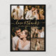 Elegant, Minimalist Gold and Black Script Wedding 5 Photo Collage Thank You Postcard. Modern wedding thank you card template featuring five (5) photo on the front and one (1) photo on the back. With the text "Love and thanks" in a swirly hand lettered typography script font in gold on black background color. Add your name, photos and thank you message. If you prefer to handwrite your note, just delete the sample text to make more space. Please contact me if you need help with this design.