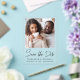 Chic clear acrylic wedding save the date announcement featuring your photo and "Save the Date" in a stylish script. Add your names, wedding date and location in modern typography.