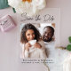 Clear acrylic wedding save the date announcement featuring your photo, "Save the Date" in a chic script, and your names, wedding date and location in simple, modern typography.