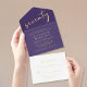 Elegant purple 70th birthday party all-in-one invitation that features "seventy" in a chic large script, your name in elegant serif typography, the party details in simple lettering, and a white tear-away RSVP response card, all rendered in your choice of genuine gold, silver or rose gold foil.