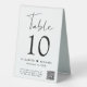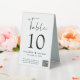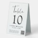 Chic wedding reception table number sign featuring "Table" in a stylish modern script, the table number in classic serif typography, your names joined together by a heart, your reception date, and a QR code linked to your website for guests to scan to upload photos or for other reasons. Create each table number sign and add to your shopping cart one at a time, then check out once all numbers are in your cart.