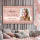 Elegant Modern Sparkle rose gold glitter metal Personalized Photo Happy 21st Birthday Party Banner. This Girly Adult feminine Birhday party decor featuring "Happy 21st Birthday" text in a stylish handwritten calligraphy script and custom name and your photo, date on blush pink or rose gold faux brushed metallic foil background with loose glam glitter frame around. Ideal for a feminine adult or girly milestone birthday celebration, this perfectly captures the essence of a modern rose gold or blush pink glitter sparkle girly birthday party. Perfect for a welcome banner or even a party decoration.