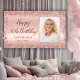 Elegant Modern Sparkle rose gold glitter metal Personalized Photo Happy 50th Birthday Party Banner. This Girly Adult feminine FIFTY (FIFTIETH) Birhday party decor featuring "Happy 50th Birthday" text in a stylish handwritten calligraphy script and custom name and your photo, date on blush pink or rose gold faux brushed metallic foil background with loose glam glitter frame around. Ideal for a feminine adult or girly milestone birthday celebration, this perfectly captures the essence of a modern rose gold or blush pink glitter sparkle girly birthday party. Perfect for a welcome banner or even a party decoration.