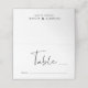 Chic wedding table number place card with "Table" in a stylish modern script and blank lines for you to fill in the table numbers and names of your guests. On the back, add your first names joined by a heart and your reception date.