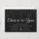 Our elegant anniversary party invitations in chic black and white feature a rich black background with strings of white lights across the top, and "Cheers to XX years" in chic calligraphy script typography. Customize for any milestone anniversary; example shown for a 40th anniversary. Personalize with your wedding anniversary celebration details beneath in white lettering.