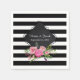 Custom wedding paper napkins done in a black and white striped pattern. A black decorative text area, in the middle of the napkin, is decorated with watercolor pink peonies, on the bottom. Personalize the text with the bride and groom's names and wedding date.