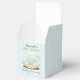 A lovely tea party themed baby shower favor box that features a soft baby blue, yellow and white color scheme. An original illustration of a pretty china teacup is set against a pale blue stripe background and accented with a whimsical mix of typography.