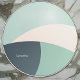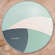 This circular design features large, overlapping arcs of soft, muted colors—primarily mint green, an off-white or pale beige, and a deep gray-blue. The curves intersect in a way that creates smooth, flowing sections, almost like waves or stylized geometric shapes. The name “Samantha” is placed within one of the darker arcs, providing a personal touch. Overall, it has a clean, modern, and minimalist look, with a calming palette and gentle curved lines.