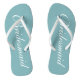 Chic teal blue bridesmaid beach wedding flip flops. Personalizable elegant flipflops for bride's entourage / team bride. Make your own personalized wedge sandals for bride, brides maid, maid of honor, flower girl, mother of the bride, mother of the groom, guest etc. Cute summer slippers for nautical or beach theme marriage near the seaside. Also nice as coastal wedding party favor for guests or as travel present for newlyweds going on honeymoon holiday destination. Create a set for him and her. Stylish script typography template design. Create your own pair of classy flipflops for groomsmen and guests. Fun souvenir slippers set for summer in july and august. White, black, pink or blue strap color. Change quantity to get a cheap discount price.