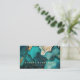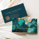 This dark, moody modern business card features an alcohol ink and faux glitter abstract painting in teal blue and gold. Personalize it with your name in chunky gold-colored serif font and your business information in sans serif font. The back of the card features gold-colored text on a solid deep teal background, along with a QR code that directs customers to your business website.