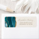 The left-hand edge of this elegant modern wedding invitation return address label features a teal blue watercolor agate border trimmed with faux gold glitter. The customizable text combines gold-colored handwriting and copperplate fonts on a neutral ivory background.