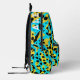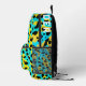 This cool, youthful backpack features a colorful trendy design with orange, black, turquoise leopard spots pattern allover, and a white customizable name on the top with a large bold script.