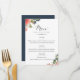 Chic typography, bohemian coral and navy blue watercolor flowers and foliage, wedding menu card with hand drawn script and decorative accents. Backing color shown in muted navy blue can be customized.