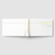 Gold foil chic typography minimalist wedding guest book. This elegant wedding guest book showcases a clean and minimalist design with gold foil typography against a white background. The simplicity of the design is enhanced by a gold foil horizontal line that runs across the upper portion of the book. By incorporating the names of the couple, the design creates an illusion of extension towards the right side of the book. The back cover is of solid white color and a contrasting gold horizontal line.