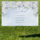 A beautiful watercolor wedding welcome sign featuring dusty blue hydrangeas, white roses, and eucalyptus greenery. This sign is perfect for welcoming guests to your wedding and will add a touch of elegance to your special day.