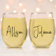 Chic set of stemless wine glass favors for guests at your bachelorette party personalized with their names in a thin elegant calligraphy script.