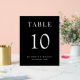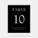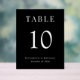 Chic black acrylic wedding reception table number sign featuring "Table" and the table number in elegant white serif typography, and your names and reception date in modern white typography. Create each table number and add to your shopping cart one at a time, then check out once all numbers are in your cart.