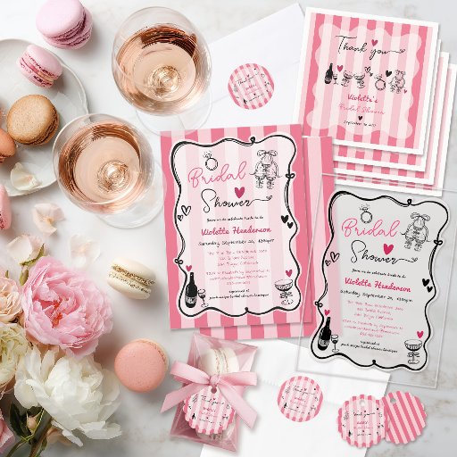 Celebrate the bride-to-be with this chic hand-drawn bridal shower tabletop sign. Featuring whimsical illustrations in contrasting black, casual handwritten script-inspired fonts, girly bows, and pink hearts with a retro flair, this elegant acrylic sign is perfect for a stylish champagne brunch, a romantic wedding shower, or a unique garden party for a soon to be bride. Feel free to reach out if you need any help with customization.