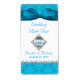 Elegant monogram mini wedding wine labels ready for you to personalize with your own information. Graphic artwork of a white label, with a blue on turquoise damask design on top and bottom. Graphics of a ornate silver tone plaque, in the center has a one letter turquoise monogram. A silver tone jewel like garland and a pretty turquoise bow border the top and bottom of the white text area of this custom label. Great for your wedding reception or your home made wines.