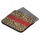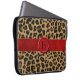 Stylish 15" laptop case done in a brown and black spotted jaguar fur pattern. Graphics of a red satin looking ribbon, runs across the middle, with a red wax seal that has a black one letter monogram. Personalize the monogram for yourself or as a purrrfect gift idea.